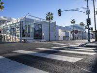 This stock photo showcases a stunning cityscape in Los Angeles, California, USA. The modern architecture of the buildings is complemented by the lush vegetation and clear sky. The city streets, with their well-maintained asphalt roads, are bustling with vehicles and pedestrians. The image captures the vibrant urban life of this cosmopolitan city, with shops, offices, and business establishments lining the streets. The photo also features a zebra crossing and a street light, highlighting the careful urban design and infrastructure in place. Experience the charm and energy of Los Angeles in this captivating image.