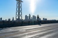 A sunny day in Los Angeles, California. The modern architecture of high-rise buildings and bridges reflects in the calm waters of the lake. The clear sky and sunlight add a vibrant atmosphere to the cityscape.