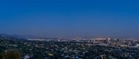 Breathtaking view of Los Angeles cityscape at dusk, illuminated by the full moon. Modern architecture blends with dark skies, creating a captivating skyline. Discover the charm of the City of Angels from above.