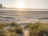 a beach with grass and sand with the sun setting above it as the sky passes