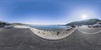a 360 - degree view of a town by the water with the sun in the sky