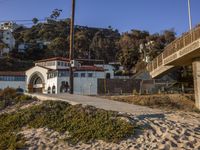 A picturesque coastal town in California, USA. Classic architecture and suburban residential areas blend with mountain and ocean views. Clear skies highlight the stunning beach and tree-lined streets. Perfect vacation destination.
