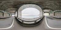 The Pacific Coast Highway in California winds through a tunnel, leading to a breathtaking view of the ocean. The cloudy day and grey sky add to the dramatic landscape. A concrete bridge connects the road to the coastal cliffs.