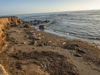A breathtaking view of the California coastline at dawn. The high coastal cliffs and rock formations create an elevated natural environment. The clear sky reflects beautifully on the water's surface, highlighting the beauty of the ocean. A perfect day to explore nature and its inhabitants.