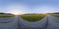 A scenic road in California at dawn, cutting through lush green grass and leading towards the majestic mountains in the background. The clear sky and vibrant sunset create a picturesque landscape.