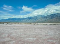 This is an image of an open space in California, USA. The photograph captures the desert landscape with a large mountain range in the background. The salt surface of the lake creates a pink and gray appearance, while clouds can be seen above. The clear day highlights the vastness of the open space. This photo represents the unique beauty of the California desert.