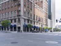 This is an image of a modern architectural building in Los Angeles, California. The cityscape showcases the high-rise condominiums and office buildings in the bustling business district. The photo captures the vibrant urban design of the residential area, with trees and vegetation lining the sidewalks. The road surface, made of asphalt, is filled with automobiles and vehicles, indicating the movement and activity of the city. In the foreground, a public space with a restaurant and outdoor seating provides a place to eat out. This image represents the dynamic and diverse atmosphere of Los Angeles.