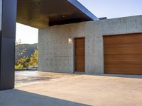 garage door and garage floor with trees in the distance next to it, and mountain views