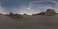 A scenic overlook in California, featuring an old-fashioned street with two large rocks and grass. The sky transitions from a colorful sunset to a dark night, with the moon rising above. A perfect spot for recreation and enjoying the open space.