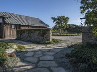 This image showcases a charming home surrounded by stone stepping and a beautifully landscaped front yard in Los Angeles, California. The architecture of the house reflects the rural charm of the area, with a cobble stone walkway leading to the large front door. The property is nestled among trees and features a stone wall and shed in the courtyard. The clear sky overhead highlights the peacefulness of the residential area. This photo captures the essence of a sunny day in California, showcasing the beauty of the rural landscape and the inviting entry to the home.