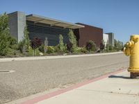 This image captures the vibrant city life of Los Angeles, California. The modern architecture of a low-rise residential building stands tall against the clear sky. The urban design features a yellow fire hydrant, standing out on the sidewalk surrounded by bushes and trees in the foreground. The scene showcases the urban landscape of this bustling city, with its asphalt roads and distinct residential areas. The property exudes a contemporary charm, reflecting the real estate opportunities in this vibrant town. This photo captures the essence of city living in Los Angeles.