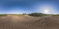 Two panoramic views of a dirt road in a lush field with grass on either side. Bushes line the road, creating a rural landscape. The clear sky and natural environment enhance the scenic beauty of the area.