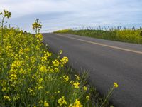 A picturesque rural landscape in California. The vibrant green fields are filled with canola flowers, creating a carpet of yellow. The gloomy grey sky adds a touch of drama to the natural environment.