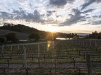 This is an image of a rural road at dawn in California, USA. The asphalt road is lined with lush green grass and trees, as the sunlight filters through the clouds. The landscape showcases the beauty of nature and agriculture, with a vineyard visible in the background. The image captures the serene atmosphere of a sunny morning in California. This photo represents the break of day in the countryside of the USA.