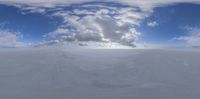 a panoramic photo of clouds and snow in the sky above a small mountain