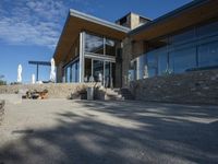 A modern residential building in California with a clean concrete facade. The suburban neighborhood features open spaces, courtyards, and gardens. The clear sky reveals contrails above the villa, creating a picturesque backdrop.