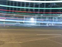 blurry lights from cars on a city street at nighttime, with buildings behind