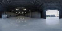 A spacious industrial warehouse in Los Angeles, California. The open concept design features black metal construction and white tile flooring. The clear sky illuminates the interior, creating a bright and versatile space for a photo studio or sound stage.