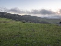 This is an image of a scenic landscape in California, USA at dawn. A road winds through the grassy fields and open spaces, surrounded by mountains and hills. The foggy atmosphere adds a sense of mystery and gloom to the elevated terrain. The lush green vegetation and the clear sky in the break of day create a serene and natural environment. This photo captures the beauty of California's wilderness and the tranquility of its mountainous regions.