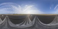 a street view with an empty parking lot in the middle of the road, and in the background are some very long white lines that lead to different directions