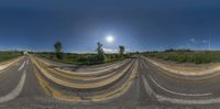 a road and two lanes with multiple yellow painted lines on them under blue skies with a sun