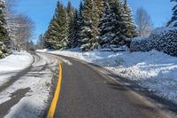 A snowy road in a suburban area of Toronto, Ontario, Canada. Clear blue sky creates a beautiful backdrop for the snow-laden evergreen trees. A picturesque winter day in a residential neighborhood.