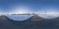 Snow-covered road in Toronto, Canada. Piles of snow line the road, creating a wintry landscape. Clear sky and sunlight illuminate the scene, adding a touch of brightness. A serene winter day in Toronto.