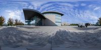 A fisheye panoramic view of a modern building in Toronto, Canada. Circular shapes in the architecture create a unique facade. People walk along the sidewalk in front, surrounded by urban design and mixed-use properties.