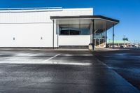 This is an image of a clear sky above a road in Toronto, Ontario, Canada. The asphalt road leads to a shopping area with multiple storefronts and a parking lot. The photo captures a typical day in the city, showcasing the urban landscape and the busy traffic. This image represents the vibrant atmosphere and commercial activities in Toronto.