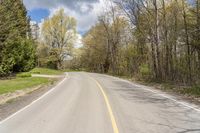 A scenic landscape in Ontario, Canada. The lush green grass lines the road, surrounded by trees and vegetation. The clouds add depth to the clear blue sky. A peaceful day in nature.