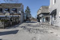 A straight view down a residential road in Toronto, Canada. The road surface is lined with suburban houses and shops. Clear sky hints at a beautiful day to eat out at a local restaurant or explore the shops in this vibrant neighborhood.