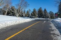 A snowy suburban road in Ontario, Canada. The clear sky contrasts with the white snow covering the asphalt surface. A typical winter day in the residential suburbs of Toronto.