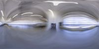 Abstract white shapes and long lines on the ceiling of a building in Chicago. The rainstorming sky outside adds an atmospheric touch to the urban atmosphere. A night scene illuminated by artificial lights.