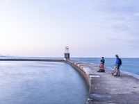 a man riding on a bicycle down the side of a pier near a light house