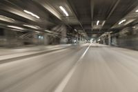 View from inside a tunnel in Chicago, Illinois. Blurry motion blur captures the bustling urban night. Light streaks illuminate the concrete walls. A city in constant motion.