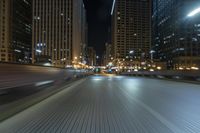 This image captures the vibrant city of Chicago at night. The modern architecture and straight road create a dynamic urban design. The cityscape is illuminated by street lights and artificial light, giving a sense of movement with light streaks and motion blur. The concrete streets and asphalt roads reflect the bustling city life of this metropolitan area. Chicago, located in Illinois, USA, is known for its iconic architecture and bustling downtown. This photo represents the energy and vibrancy of a metropolitan city at night.