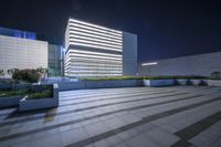A modern architectural masterpiece in Shanghai's bustling business district. Neon lights create a stunning contrast against the dark sky, illuminating the corporate headquarters. The empty plaza reflects the vibrant city life of this metropolitan hub.