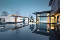 A modern hotel complex in China, featuring a large rectangular pool in the center. Surrounded by contemporary architecture, this open space offers a serene retreat. Clear sky and artificial light create an emotional ambiance.