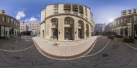 an image of a circular glass building on a street corner in the city center of town