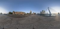 A stunning view of a building in the city, captured through a spherical mirror. Skyscrapers can be seen in the distance, creating a modern cityscape against a clear sky. This urban scene showcases the architectural beauty of Holland.