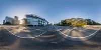 Panorama view of downtown Los Angeles, California. The city's iconic skyline, with its high-rise buildings and architectural marvels, is framed by a straight road lined with trees. The bustling city life is captured in this vibrant image.