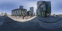 A modern cityscape in Toronto, Ontario. The intersection captures the bustling city life and architectural diversity. The clear sky highlights the straight road lined with high-rise buildings and green spaces. A skateboarder's perspective adds a dynamic touch.
