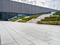 This is an image of a modern architecture conference center in Berlin, Germany. The courtyard in front of the building features stairs and hedges that line the outdoor area. The open space showcases the urban design and architecture of the city. The clear sky and clouds provide a pleasant backdrop to the modern and sleek lines of the building. This photo captures a typical day in the financial district of Berlin, reflecting the European style and urban living.