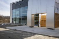 This stock photo captures a modern cityscape with a building featuring a large glass window and a door on its side. The architecture reflects the urban landscape, while the clear sky adds to the vibrant atmosphere. The building is situated on a road with asphalt surface, providing access to nearby homes, offices, and commercial properties. The reflection on the glass surface adds a touch of elegance to the structure. The photo perfectly represents the blend of contemporary design and structural integrity found in cities like Bristol, Tennessee, USA.