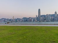 A stunning cityscape photo taken at dawn in Hong Kong. The clear sky creates a beautiful backdrop as a couple of people stand in the grass near a body of water, with a magnificent city skyline featuring skyscrapers and urban design. The coastal area adds a touch of natural beauty, with the ocean glistening in the early morning light. The grass surface and greenery provide a peaceful atmosphere, complementing the vibrant city life. The road and paver road add to the urban charm of this image.