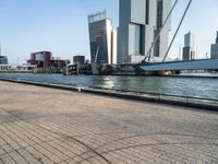 This stock photo showcases the stunning cityscape of Holland, Europe. The image captures the walkway along the water, which is a wide boat dock adorned with tall buildings and a boat on the other side. The modern architecture and high-rise condominiums reflect the urban design and infrastructure of the city. The cobblestone road surface adds character to the scene. With a clear sky overhead, this photo perfectly embodies the vibrant city life and open spaces of Holland, Netherlands.