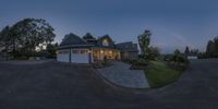 Classic American architecture showcased in this suburban home with a straight road leading up to it. The dusk sky contrasts with the artificial light illuminating the property. A tranquil scene at twilight.
