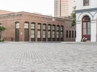 A beautiful brick road with old windows and buildings in the background, creating a charming atmosphere in downtown Los Angeles. The dawn sky above is clear, highlighting the classic architecture of this city. An open space on the ground provides a peaceful plaza for urban dwellers to enjoy the day. The cobblestone surface adds to the historic charm. This area is perfect for exploring, with hotels and restaurants nearby to satisfy your cravings for a delightful eat out experience.