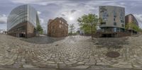 Classic architecture in Hamburg, one quarter of Deutschland. Cobblestone roads lead through urban design with modern and residential buildings. Clouds hover over the city's open spaces, creating a picturesque day scene.