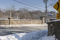 street signs on the corner next to a wall and road covered in snow, and trees